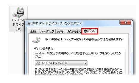 書き込み可能な光学ドライブのプロパティには、下図のように「書き込み」タブが表示されており、書き込みができないオプティカルドライブの場合には、「書き込み」タブは表示されません。