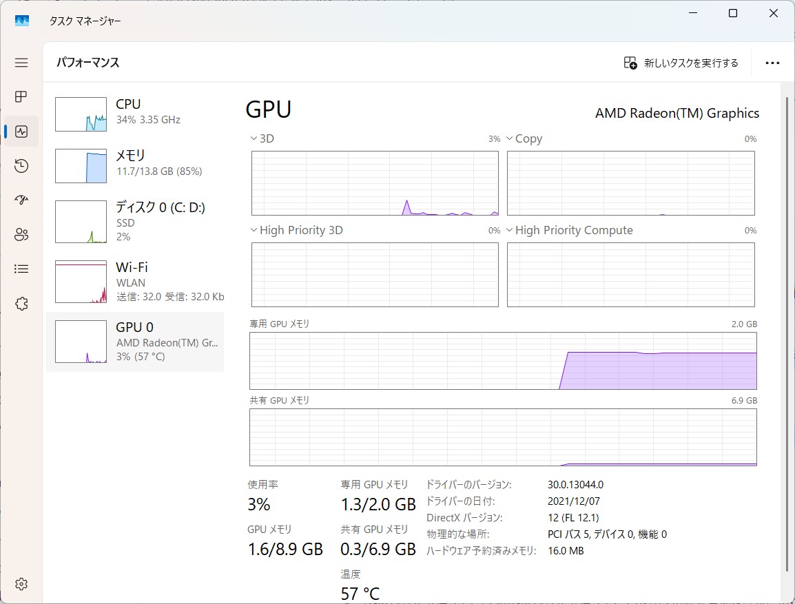 - Windowsの場合:「タスクマネージャー」→「パフォーマンス」タブ→「GPU」を選択。処理中にGPU使用率が上がっていれば正常に機能しています。