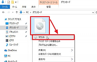 マウントとは、システムに接続する事です。イメージ ファイルをマウントすると、あたかも CD や DVD をパソコンに挿入したかのように見えます。使用したいイメージ ファイルを右クリックし、[マウント]をクリックします。