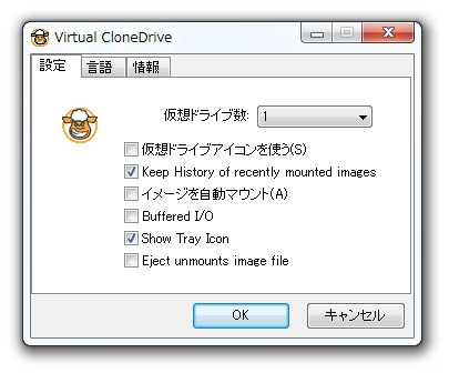 Virtual CloneDriveをインストールしてから、起動すると、この画面が表示されます。「settings」メニューについて、ご紹介いたします。