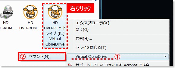 デスクトップのマイコンピュータアイコンをダブルクリックしてマイコンピュータのウィンドウを開き、Virtual CloneDriveを右クリックして「Virtual CloneDrive」→「マウント」をクリックすることができます。 また、Virtual CloneDriveソフトをインストールした後にISOファイルをダブルクリックすると、自動的に仮想CDとしてマウントすることも可能です。
