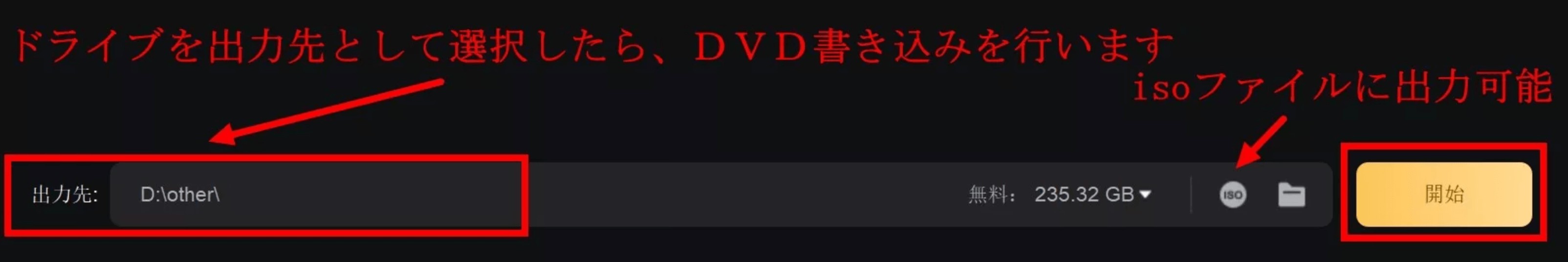 そして、ドライブの出力先を選んで、ISOアイコンをクリックしてください。「開始」ボタンをクリックして、DVD ISO 変換のプロセスが完了します。