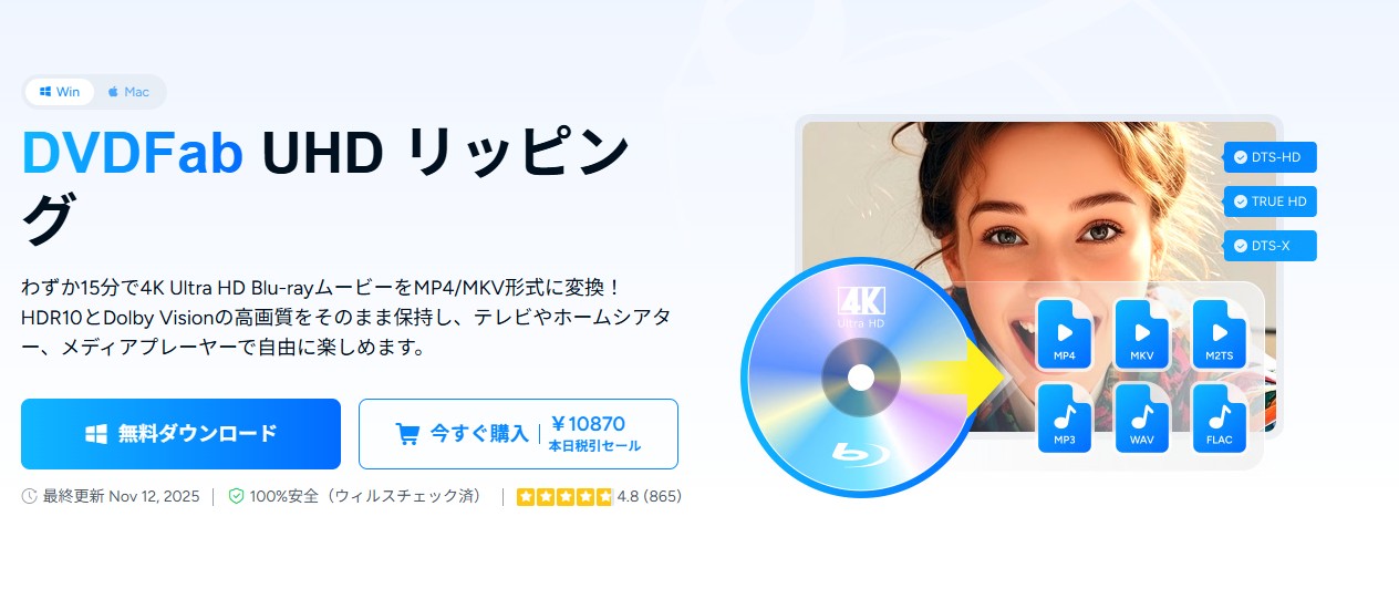 こうした相性トラブルを避けたい場合に役立つのが、「DVDFab UHD リッピング」です。DVDFabは、複雑な4Kブルーレイのデータを、テレビやスマホでも再生しやすいMP4形式などに変換しつつ、HDR10やDolby Visionの情報を保ったまま出力できます。
