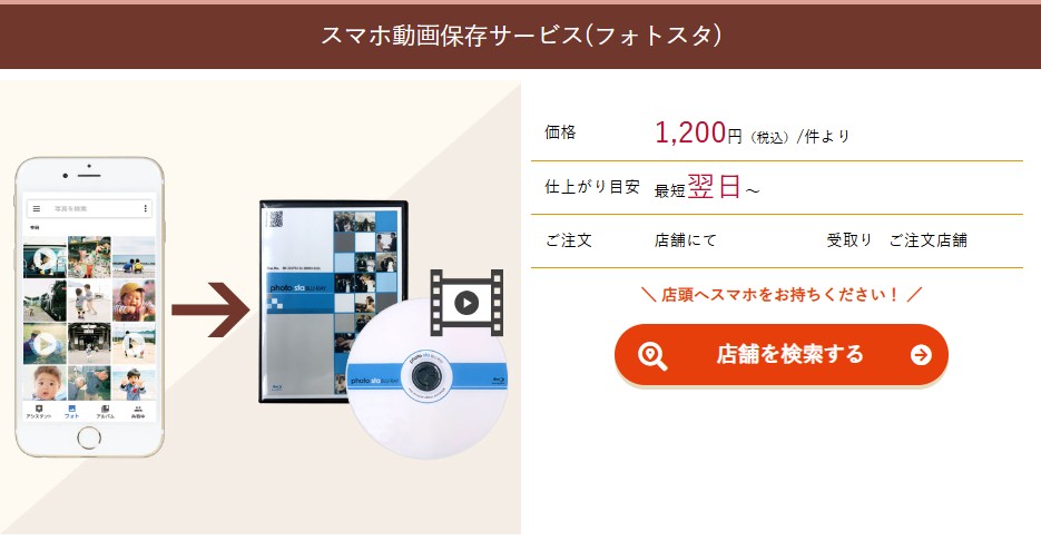 1. カメラのキタムラ「スマホ動画保存サービス(フォトスタ)」日本全国に店舗があるカメラのキタムラでは、SDカードの動画をテレビで見られるDVD(DVD-Video形式)にするサービスを提供しています。