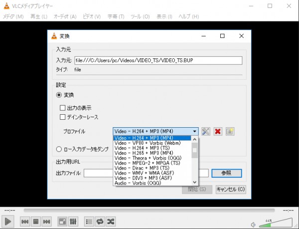 - VLC → 「H.264 + MP3(MP4)」を必ず選択
