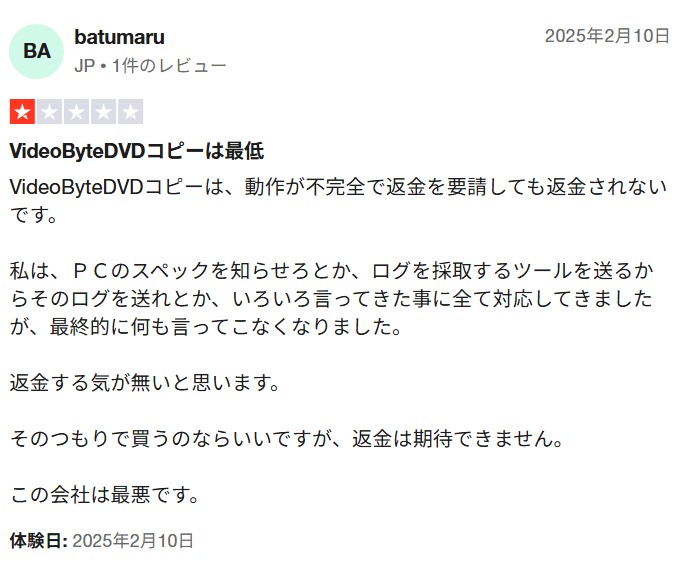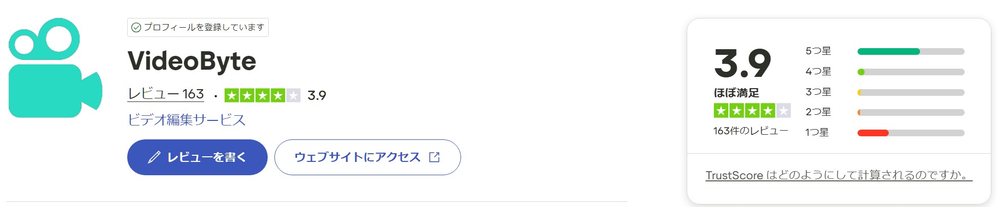 - VideoByteのTrustpilotでの評価は3.9と、やや低めです。操作が簡単で目的を達成できたという好意的な声がある一方で、不具合や返金対応への不満、無料版の制限に対する否定的な意見も見受けられます。