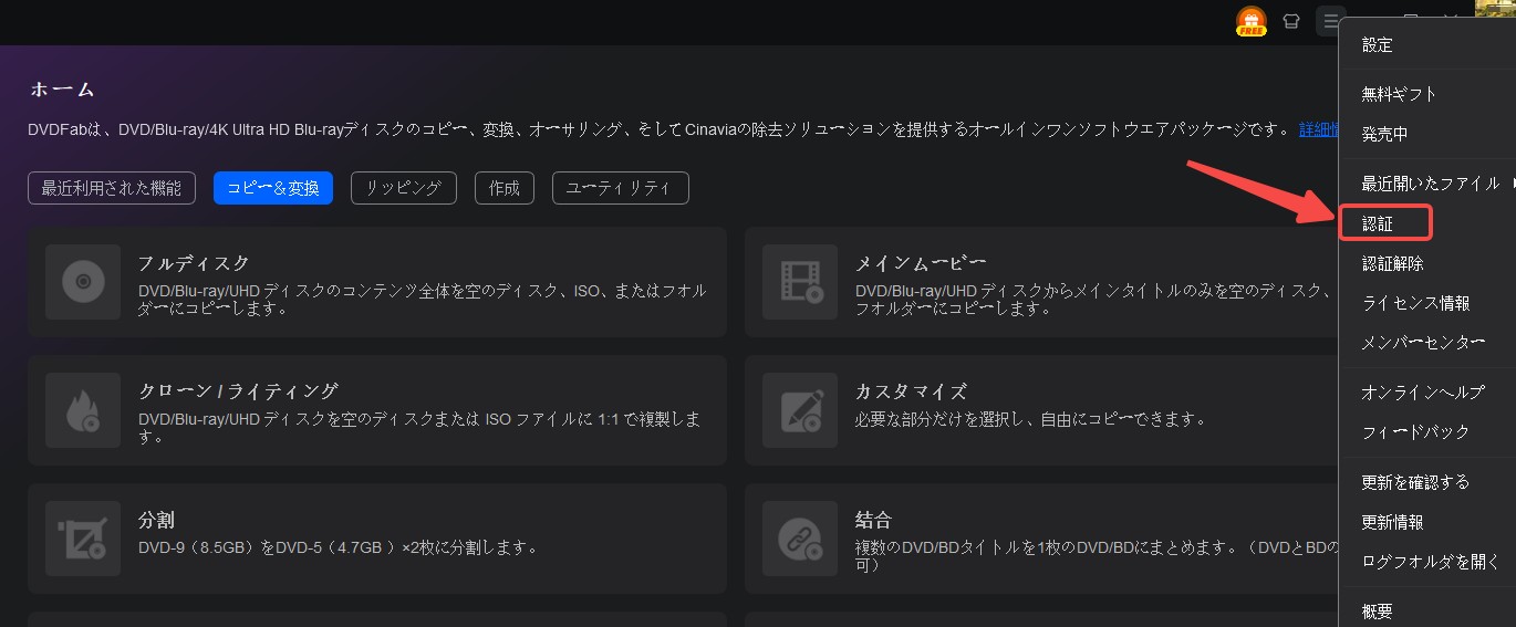 ライセンスを認証する方法:DVDFabを起動して、「認証」をクリックして、メンバーに登録したメールアドレスとパスワードを入力して、認証をクリックします。あるいは、DVDFab を起動して、DVDFabのメイン画面の右上隅にある三本線 (≡)より、「認証」を選択して、ライセンスを認証します。