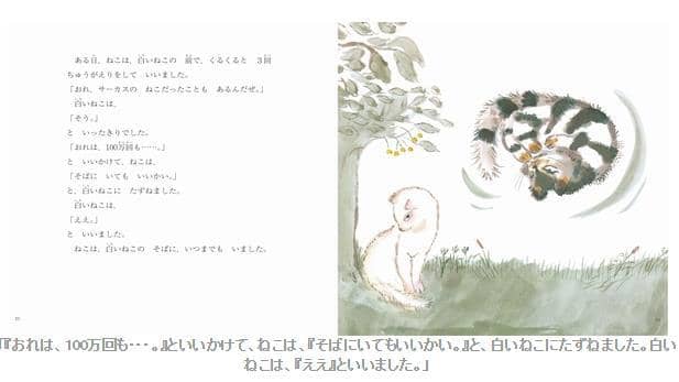 100万回死んでも悲しくなかったねこでも、しろねこと出会ってから、はじめて愛することを知り、愛する者を失って涙を流した。これはどれほど幸せなことだ、愛の死別があるこそ人生である。愛されて、愛する人のために生きて、子供を産んで育って、家族を守り続け、額に最後のキスが刻まれて、あの世に行くのは神様が下さった円満である。