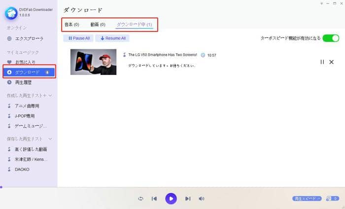ダウンロードが開始します。ダウンロードの進行状況は左の「ダウンロード」をクリックすれば確認できます。また、ダウンロードできた音声も「音楽」のところでチェックすることができ、再生したり、プレイリストに追加したりすることができます。