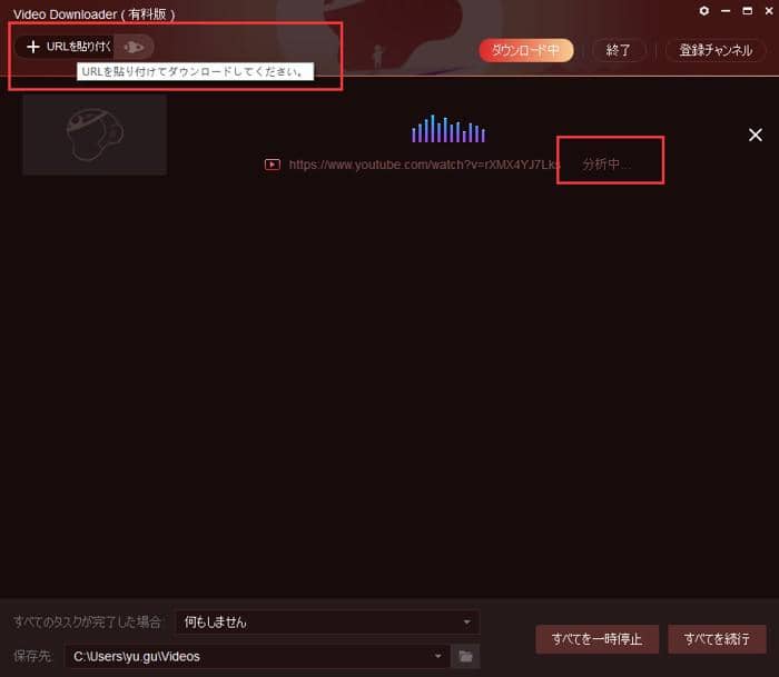 左上のボタンをクリックすると、表示されている検索バーにダウンロードしたい動画のURLを入力して、ダウンロードを確認します、これでダウンロード任務が始まります。