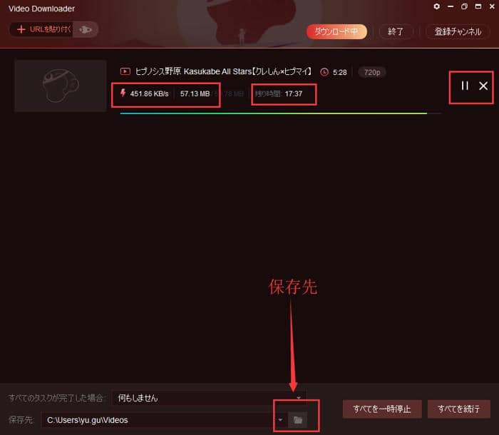 ダウンロード中の時動画のタイトル、ダウンロード速度、サイズ、残り時間などの情報が見られます、途中で一時停止、あるいは任務の削除も可能です。好みの記憶場所を設定することができます。これを行うには、アクティブなソフトウェアウィンドウの下部を見て、保存場所を選択するオプションが表示されます。
