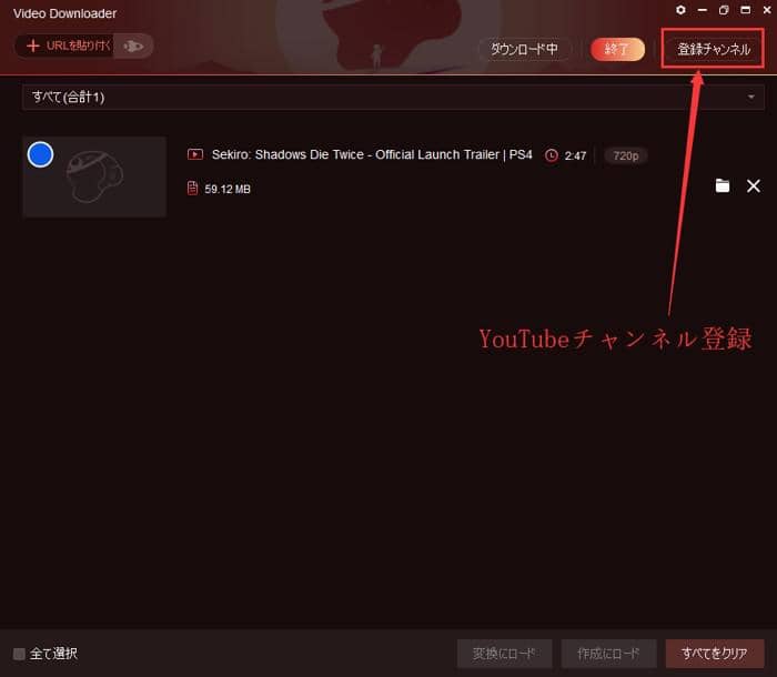 ダウンロード完了したら「終了」をクリックして出来上がった動画が縦で並んでいます。なお、右上の「チャンネル登録」をクリックすると、YouTubeアカウントを登録することができます。登録したYouTubeチャンネルから動画を自動的にダウンロードすることができます。