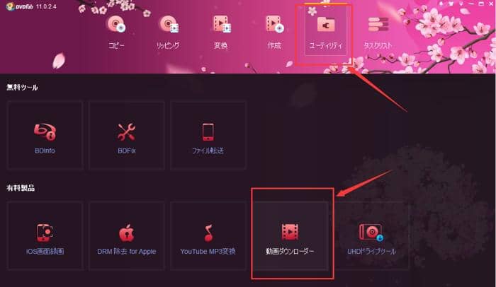 Windows PCにインストールされているDVDFab 11ソフトウェアを起動し、「ユーティリティ」タブに直接向かいます。このタブをクリックし、さらに動画ダウンローダーをクリックします。これにより、DVDFab 動画ダウンローダーをPCに初めてインストールするための自動バックグラウンドダウンロードとインストールプロセスが開始されます。バックグラウンドのダウンロードと自動インストールの後、DVDFab 動画ダウンローダーが単独で起動します。