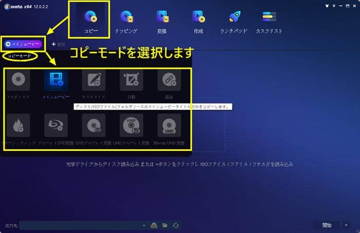 DVDFab 12を起動して、トップメニューへ「コピー」タグをクリックして、そして左側におけるコピーモードスイッチャーをクリックして、6つのコピーモードから1つ選択します。ここで「メインムービー」モードを例として説明いたします。