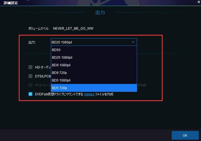 ソースのロードが完了した後、一番長いタイトル(すなわちメインムービー)はデフォルトで選択されます。必要に応じて、チャプター、オーディオ、字幕などを変更できます。また「詳細設定」画面で出力サイズはBD 50、BD 25、BD 9またはBD 5に指定できます。