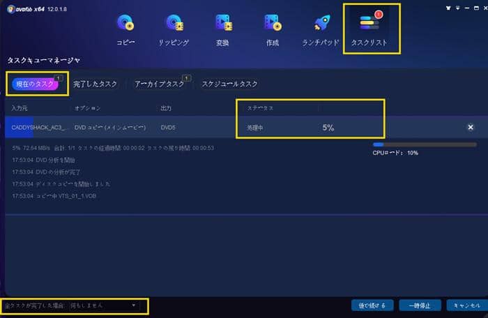 「開始」ボタンをクリックして、コピータスクを実行します。タスクリストには進捗を確認できます。