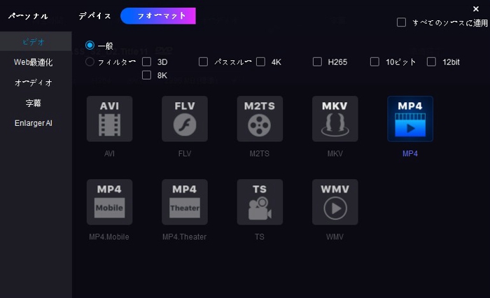 次は、メイン画面にある動画形式オプションにより、出力動画ファイルのプロファイルを選択してください。中の「デバイス」、「フォーマット」にたくさんのプロファイルが用意されています。利用中のデバイスや必要なフォーマットにより選択してください。