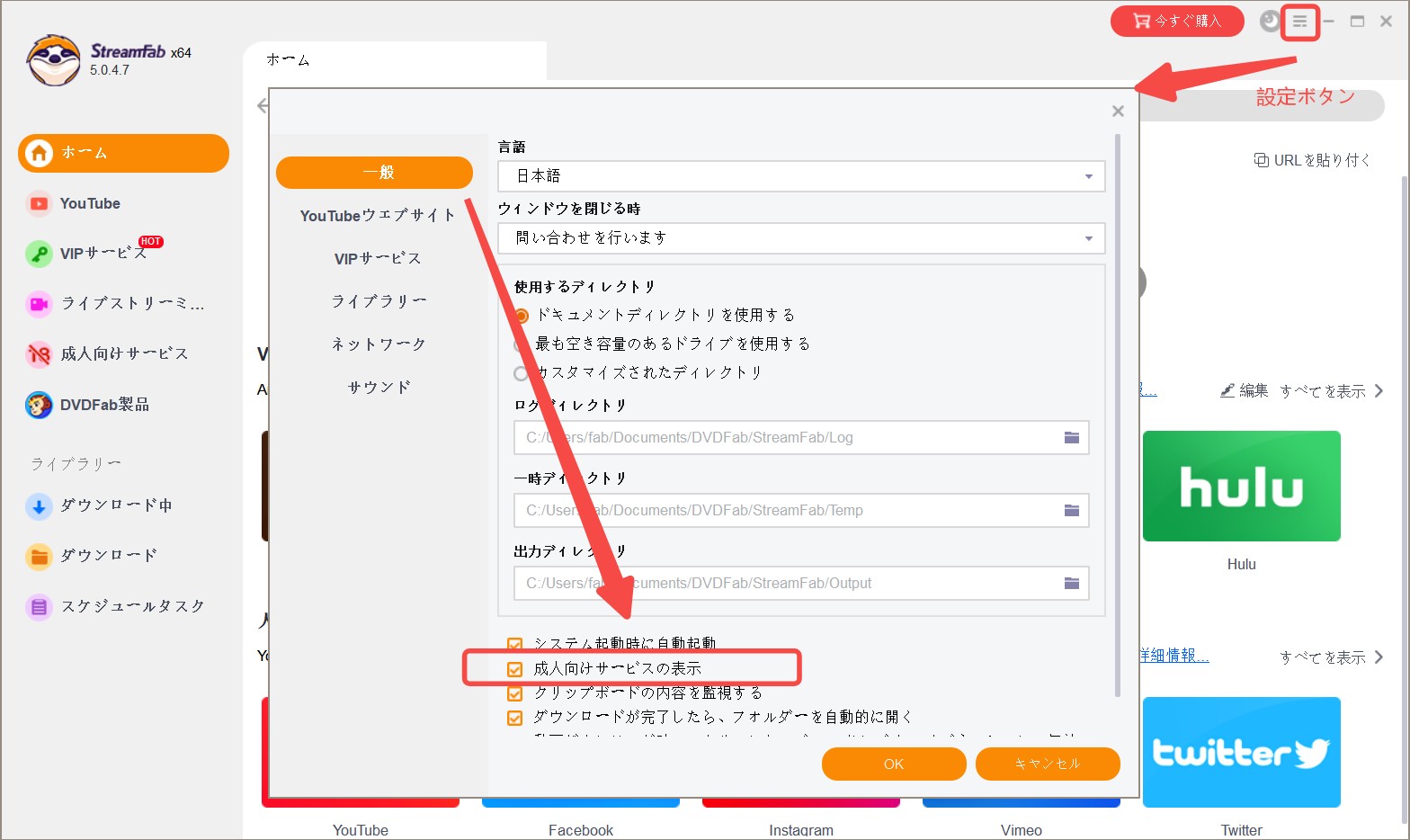ステップ2>インストール完了したら、StreamFabを起動します。まず画面右上の「三本線」アイコンをクリックして、「一般」から「成人向けサービスの表示」を選択して、「OK」をクリックして設定完了します。