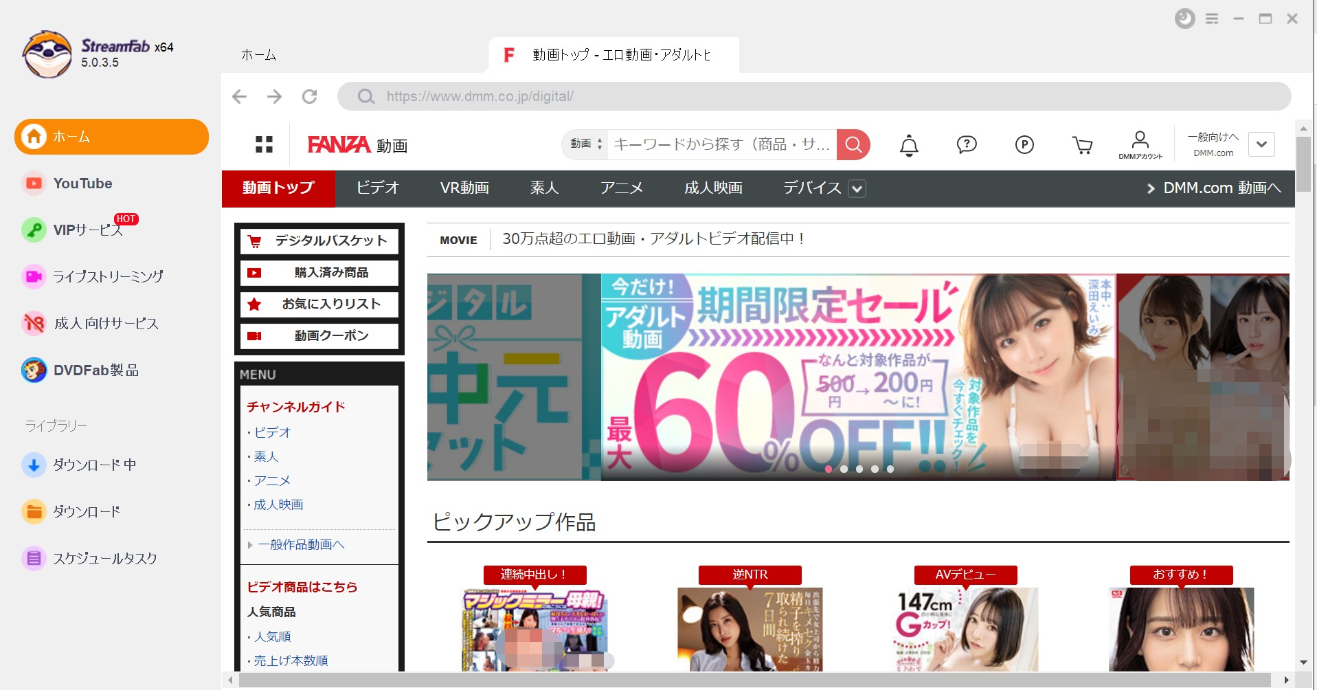 FANZA自身にはダウンロード機能が搭載されますが、いくつかの制限があります。安心でアダルト動画を永久保存したいなら、StreamFab FANZA ダウンローダーを利用して、お気に入りの女性向けアダルト動画をダウンロードできます。