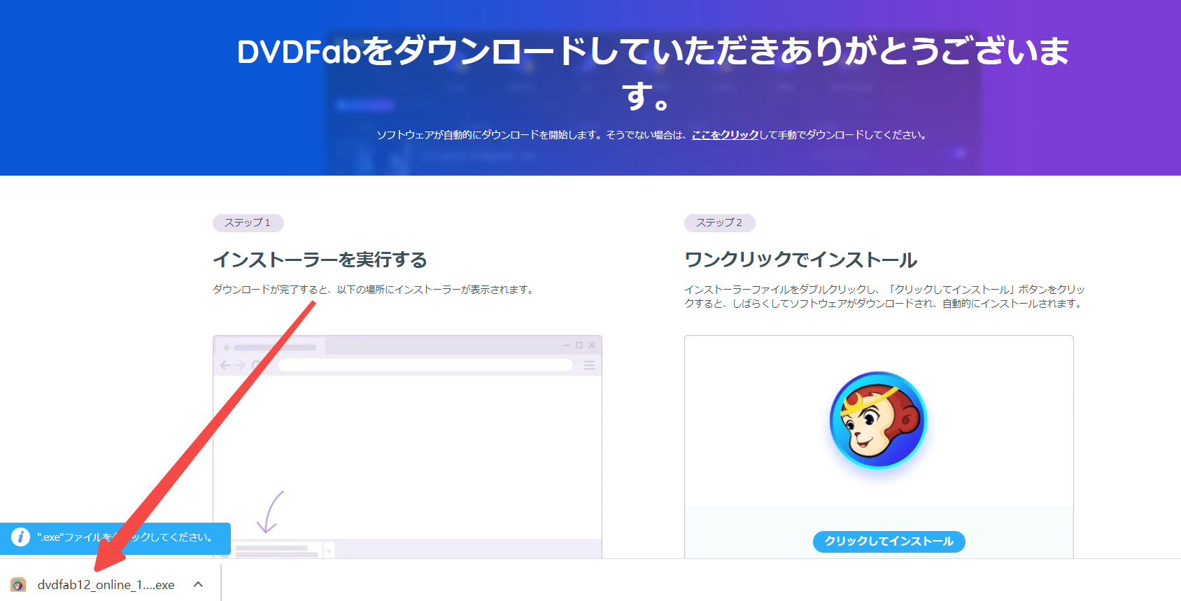 ステップ1> DVDFab 12をダウンロードして、 ".exe"ファイルをクリックしてインストールします。