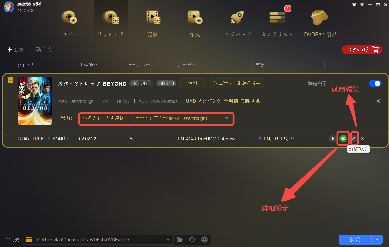 ステップ4> タイトル、チャプター、オーディオと字幕を選択出来て、ニーズに応じて、タイトルの名前を定義して、詳細設定もできます。内蔵の編集機能でDVDビデオを編集できます。