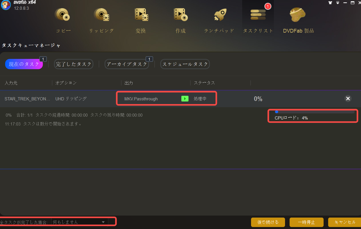 ステップ6> 画面には、CPUコードの速度とDVDからMKVへの変換タスクの残り時間が表示されます。この機能により、ユーザーはコンピュータの画面を監視する代わりに、DVDからMKVに変換している間に他の作業を行うことができます。