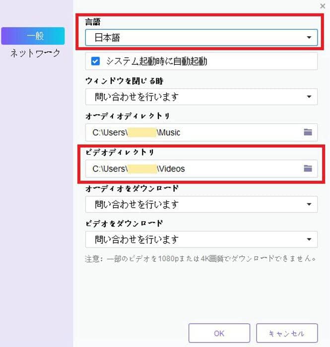 まずは「一般(General)」タブで、「言語(Language)」を「日本語」にしておきましょう。そして、「ビデオディレクトリ」から動画の保存先フォルダを指定します。もちろん、ほかの設定もご自由に行ってください。