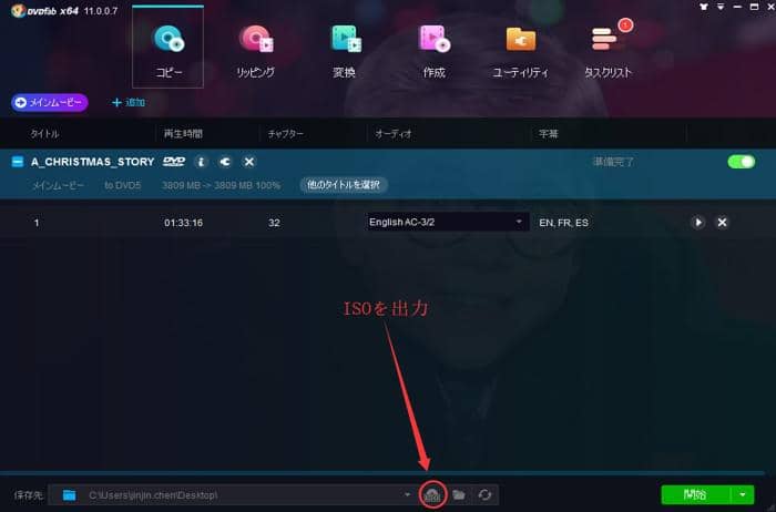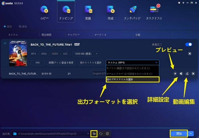 ステップ3.上記の設定が完了したら、メイン画面の下側にある「保存先」から出力ファイルを保存する場所を指定してください。そして、「開始」ボタンをクリックすればいいです。後は、DVDビデオをリッピングして選択されたプロファイルに変換するプロセスが完了するまでお待ちください。