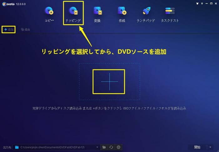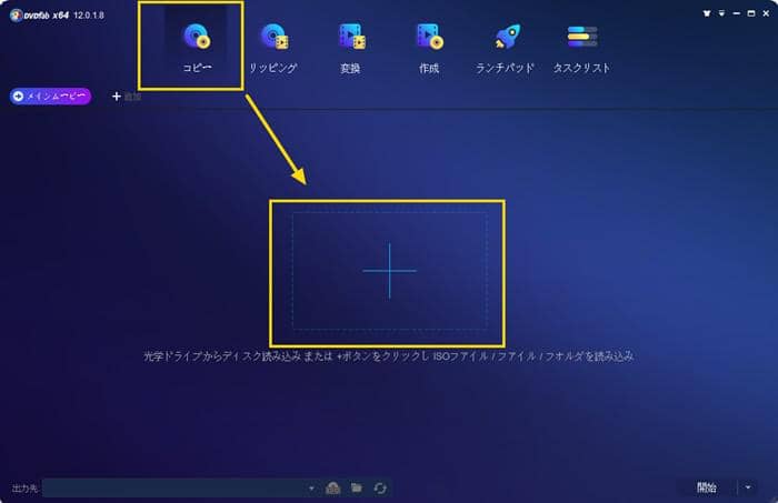 光学ドライブにコピーしたいDVDディスクを挿入して、またはメインインタフェースにおける「+」ボタンをクリックしてソースをロードします。ソースはISOファイルまたはフォルダである場合、それをメインインタフェースにドラッグ・アンド・ドロップすればいいです。