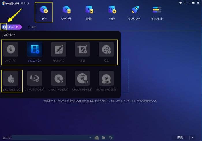 DVDFabを起動して、トップメニューへ「コピー」タグをクリックして、そして左側におけるコピーモードスイッチャーをクリックして、6つのコピーモードから1つ選択します。ここで「メインムービー」モードを例として説明いたします。