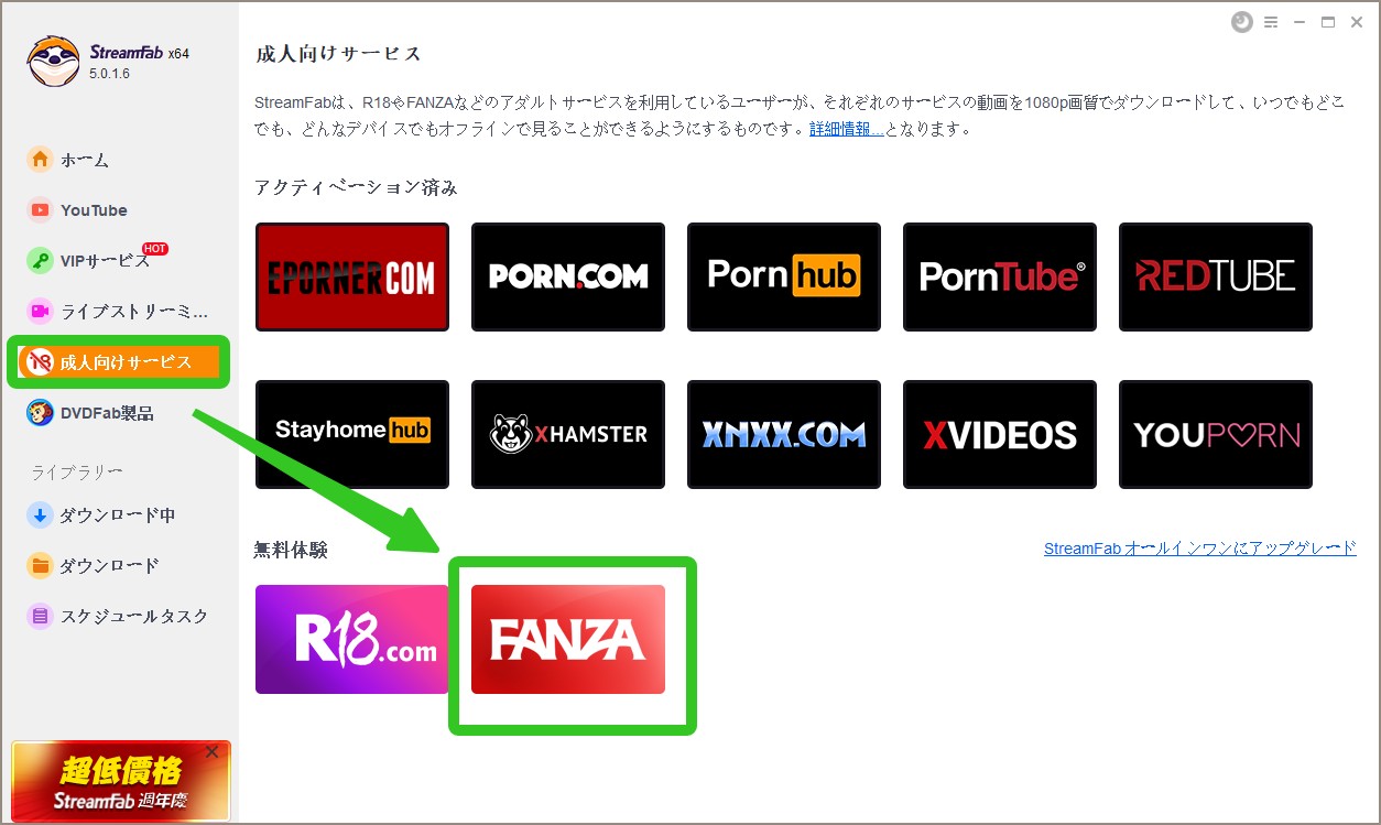 ステップ1:StreamFab Fanza ダウンローダーを起動して、設定から「ホームページにアダルトサイトを表示する」をチェックして、左のリストから「アダルトサービス」をクリックしてください。
