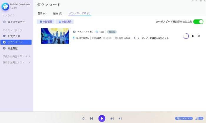 ステップ4.左側のメニューにある「ダウンロード」タブをクリックすると、ダウンロードしている動画のタイトル、ダウンロード速度、サイズ、残り時間などの情報がリアルタイムで確認できます。途中で一時停止、あるいは任務の削除も可能です。