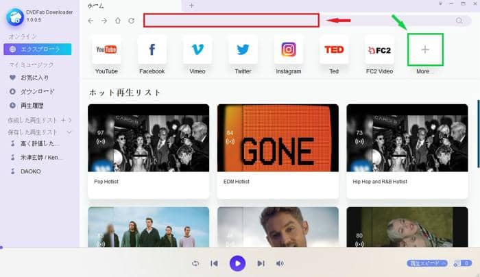 ヒント:URLがまだ分からない場合は、画面の右上における「+(More)」をクリックして、「対応オンラインサイト」から直接にお好きな動画サイトへアクセスしましょう。これからの動画探しはソフト内蔵されたこのブラウザにお任せください。