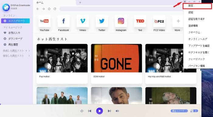 ステップ1.DVDFab動画ダウンローダーのメインプログラムを起動します。まず最初に、右上にある「下向き三角」をクリックして、「設定(Settings)」を行います。