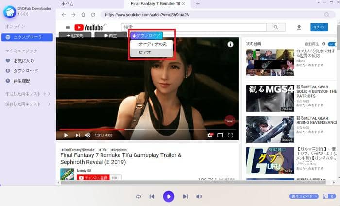 ステップ3.動画再生画面の上側に現れる「ダウンロード」ボタンにマウスカーソルを移動すると、ドロップダウンリストが表示されますが、ここで「ビデオ」を選択すれば、ビデオのダウンロードが開始されます。