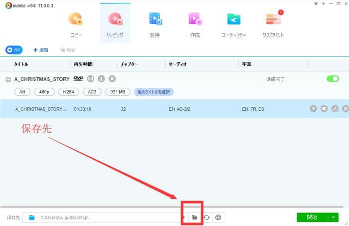 ステップ3.上記の設定が完了したら、メイン画面の下側にある「保存先」から出力ファイルを保存する場所を指定してください。そして、「開始」ボタンをクリックすればいいです。後は、DVDビデオをリッピングして選択されたプロファイルに変換するプロセスが完了するまでお待ちください。