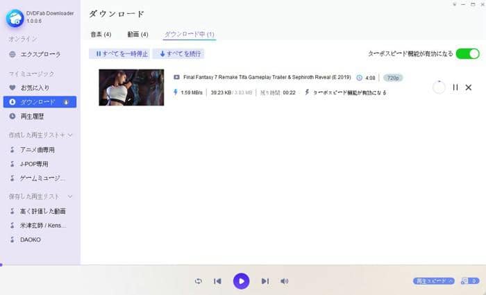 ヒント:右上のスライドをクリックすれば、ターボスピード機能を有効にすることができます。より爽快なダウンロード体験をもたらすこの機能を無限に利用するのが有料版ならではのメリットです。