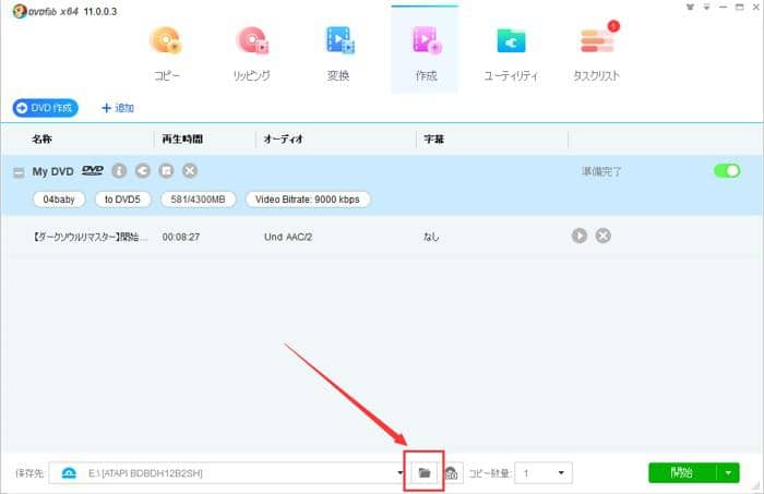 メインインタフェースの一番下側における「保存先」のドロップダウンリストからドライブを選択すると、ビデオを空白なディスクに書き込みます。「フォルダ」アイコンをクリックして、ビデオからDVDフォルダを作成します。「イメージ」アイコンをクリックしたら、ビデオをISOファイルにリッピングします。全ての設定が完了したあと、「開始」をクリックして、作成プロセスを開始します。